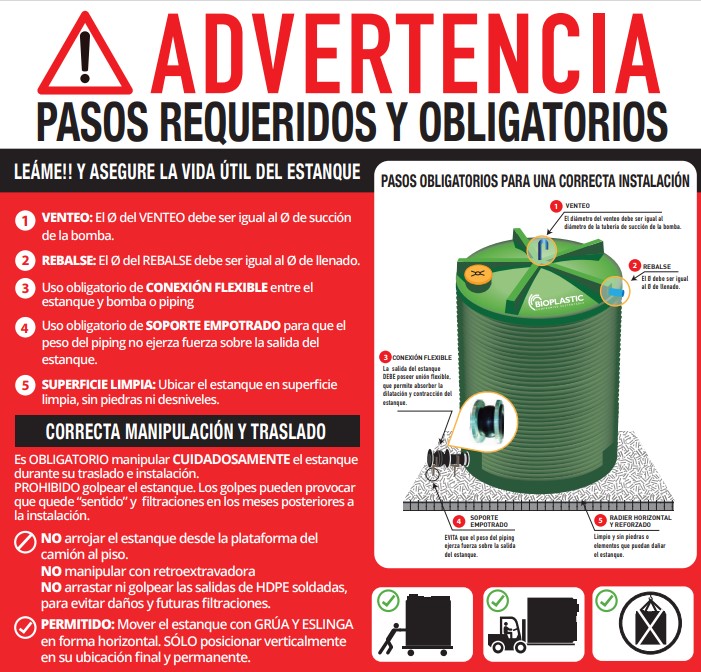 Los estanques deben ser instalados sobre una base plana nivelada sin piedras ni imperfecciones, debe soportar el peso total del estanque (incluido el líquido). Colocar siempre uniones flexibles, en caso de salidas con elementos pesados emplear apoyo empotrado al suelo. Almacenar líquidos con temperatura máxima inferior a 50 ºC. Vea también versiones REFORZADAS y EXTRA REFORZADAS.
